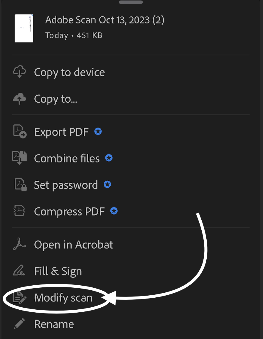 Step 9. If you want to edit your Adobe PDF please click on the '...' icon on the PDF you want to edit then click 'Modify scan'.