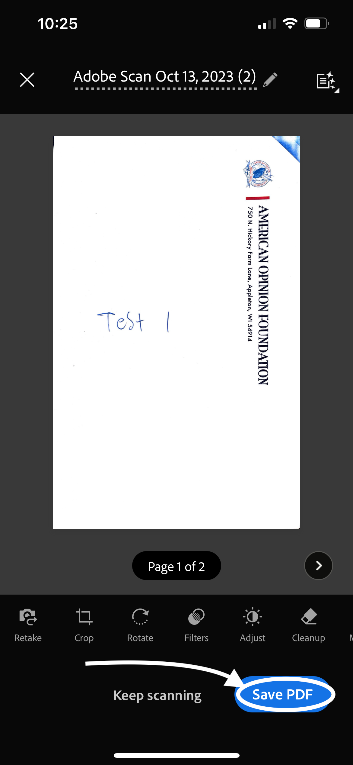 Step 8. If you are done scanning click "Save PDF" and the PDF should now be saved and you should see the PDF on your Adobe Scan home menu.