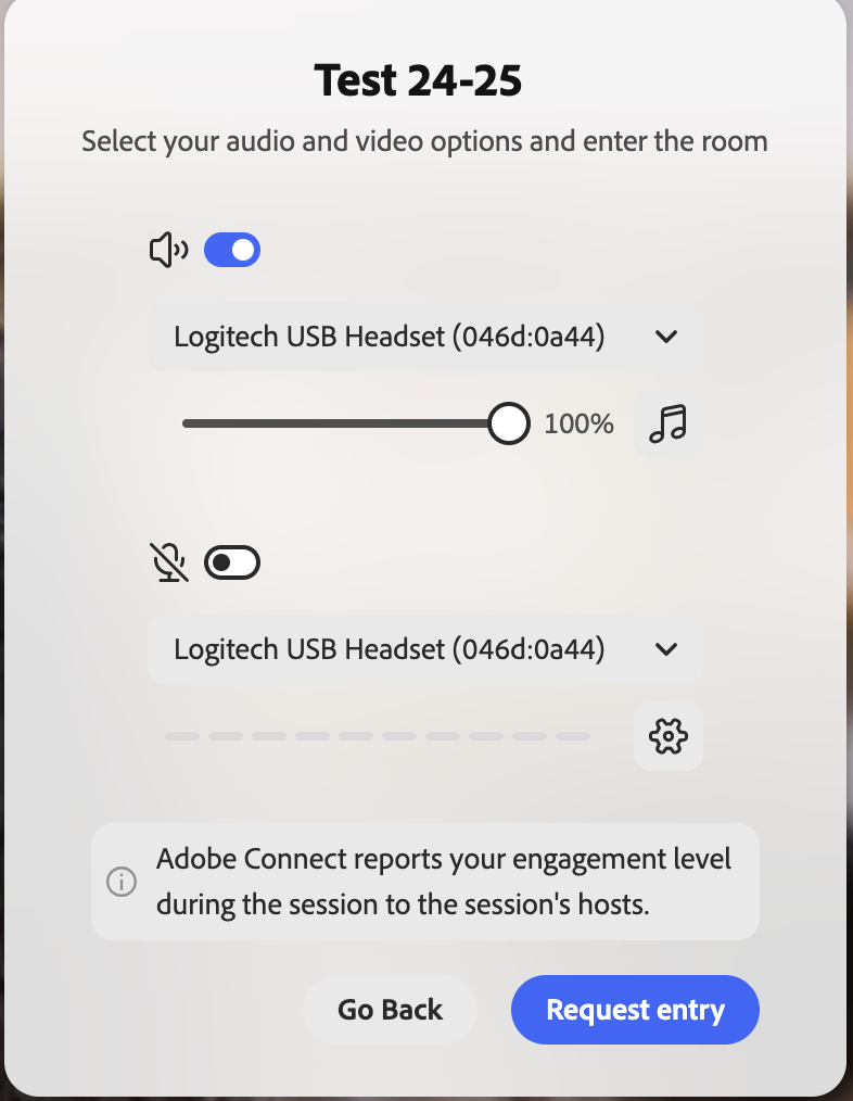 Step 5. Using the drop down arrow to the right of the 'Speaker' and 'Microphone' audio options please select the audio options that will be applicable to your Adobe session for today: