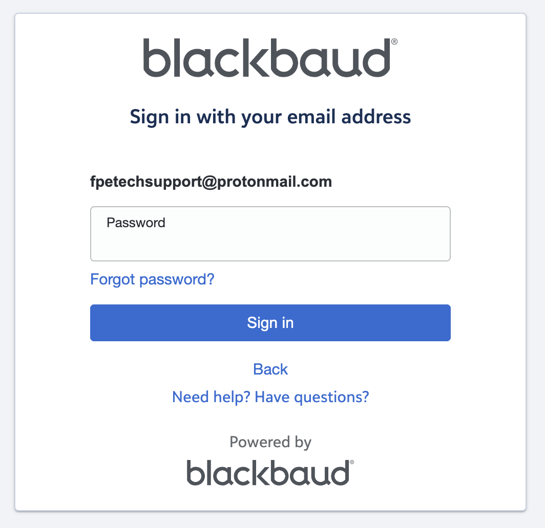 Step 1. Please insert your email in the prompt that says 'Email (BBID)' at https://fpeusa.myschoolapp.com/app/#login