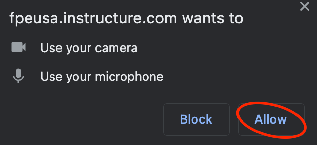 Step 5. If you get prompted by a pop up to allow 'fpeusa.instructure.com wants to' to 'Use your camera' and 'Use your microphone' select 'Allow'