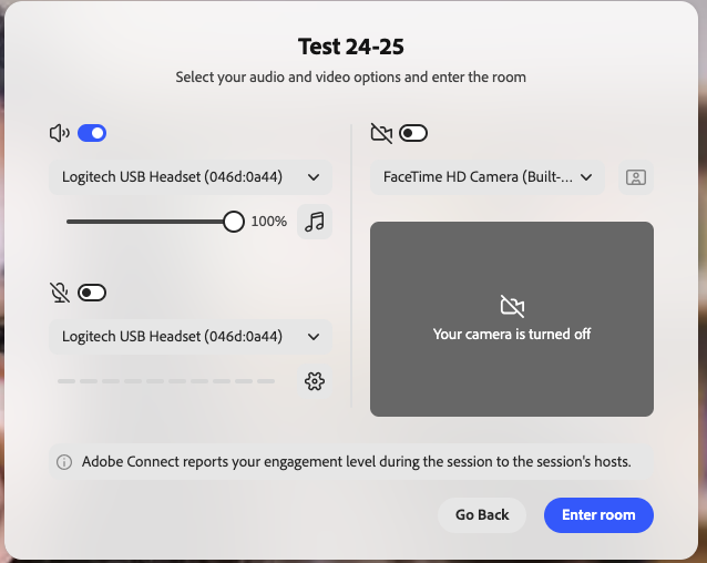 Step 5. Your Adobe Connect introduction page should now appear giving you the options to set up your Audio, Video correctly.