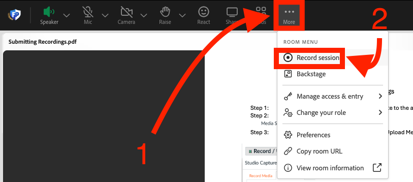 Step 7. Once you are in the Adobe Classroom click the '...' on the top menu then click 'Record session'