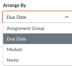 Step 7. You can arrange the assignments by Assignment Group, Due Date, Module and Name white box which opens to a sub menu under the bold words titled 'Due Date' then clicking 'Apply'.