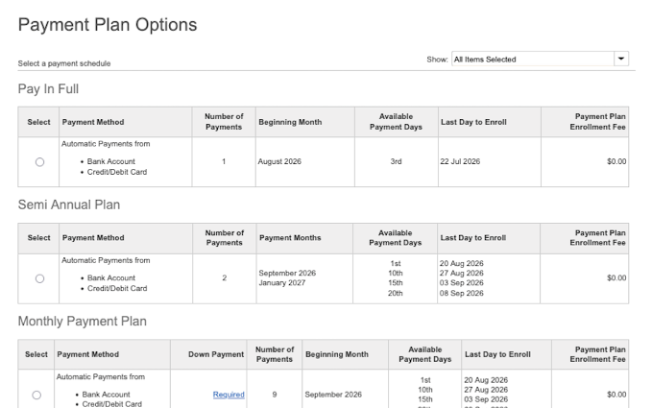 5. Pick a Payment Plan Option: Pay In Full – 1 payment paid in August