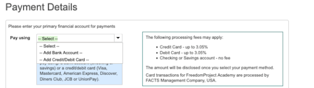 6. Payment Details: Choose between Debit/Credit Card or Bank Account