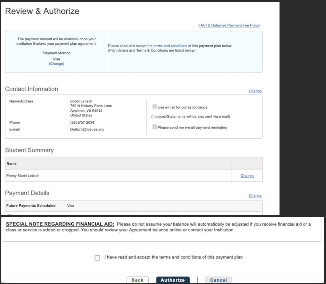 7. Review & Authorize: Make sure to read everything that you are Authorizing. Go over all information and verify that all information is correct, then click box at the bottom “I have read and accept the terms and conditions of the payment plan”. Then click Authorize. This is when the enrollment fee will be withdrawn from your payment source.