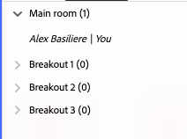 Step 9. (Optional) Please click your name in the 'Attendees' screen and hover over 'Change breakout room' and choose one or many of your breakout rooms. You can see now that all the breakout rooms are set up the same as the 'Main room' with the exception they have their own versions of the pods.